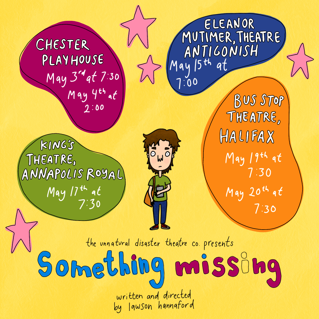 Something Missing was first performed at the 2024 Halifax Fringe Festival as part of the Unnatural Disaster Fringeship Program, which mentors one theatre creator in putting on their first Fringe show. It then won five Audience Choice Awards at this festival, including Outstanding Dramedy and Outstanding Performance. Unnatural Disaster Theatre Co. and I decided to take it on tour across Nova Scotia, and we went to Chester, Antigonish, Annapolis Royal, and back to Halifax. We received an Arts Nova Scotia grant, which allowed us to fund this tour.